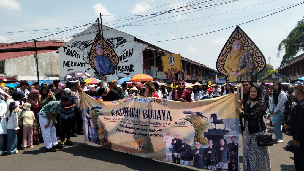 Warga Dinas Pendidikan dan Kebudayaan Kabupaten Kuningan memadati jalan utama Kota Kuningan dalam gelaran Karnaval Budaya Hari Jadi Kuningan ke-527, Minggu (5/10/2025). Dinas Pendidikan dan Kebudayaan Kabupaten Kuningan menurunkan 2.300 peserta yang mencatatkan Sejarah baru menjadikannya rombongan terbanyak dan terpanjang dalam acara Karnaval Budaya Kabupaten Kuningan.